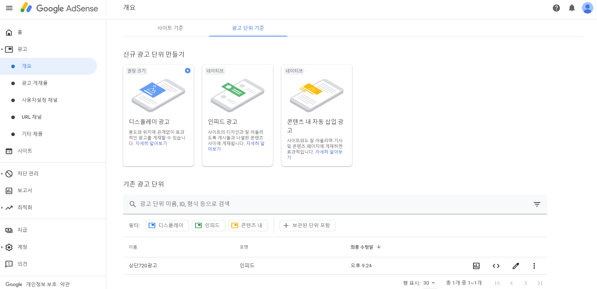 1. 광고 만들기 (구글 애드센스 > 광고 > 개요 > 광고 단위 기준)