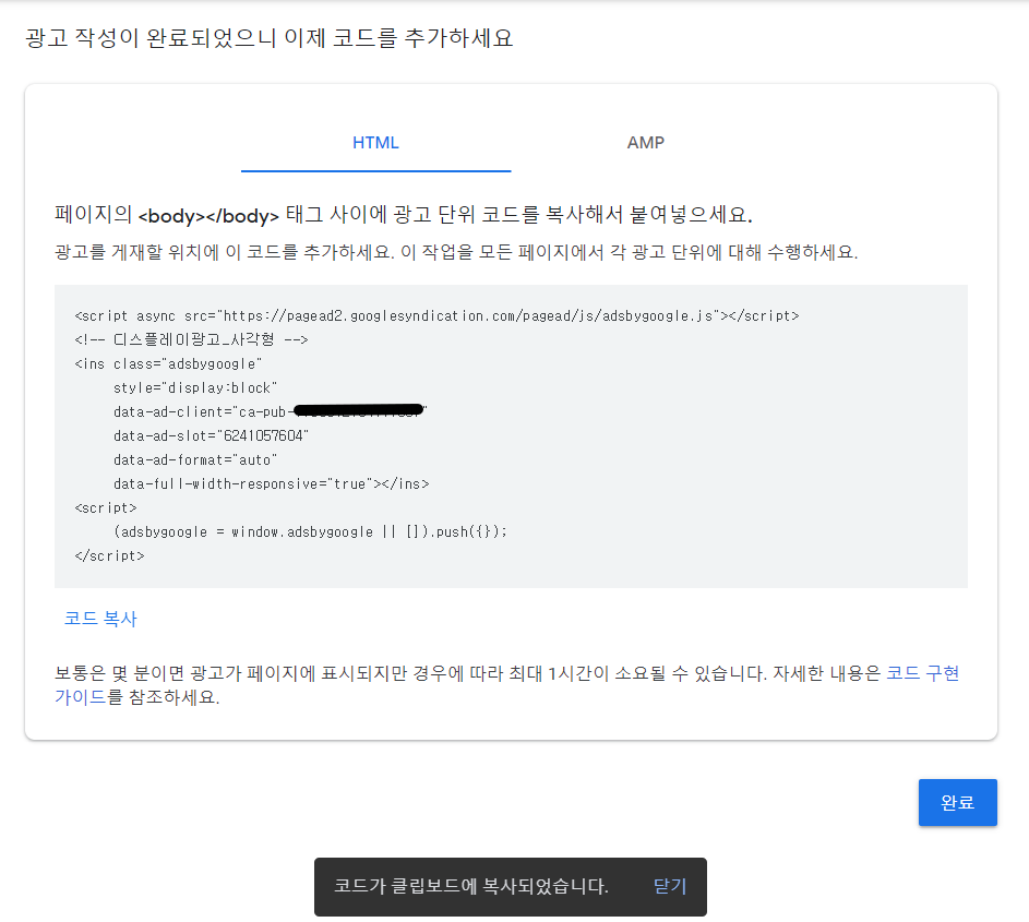 원하는 광고 배치 유형을 선택하고 복사한 '광고 코드'를 넣어주면 끝!