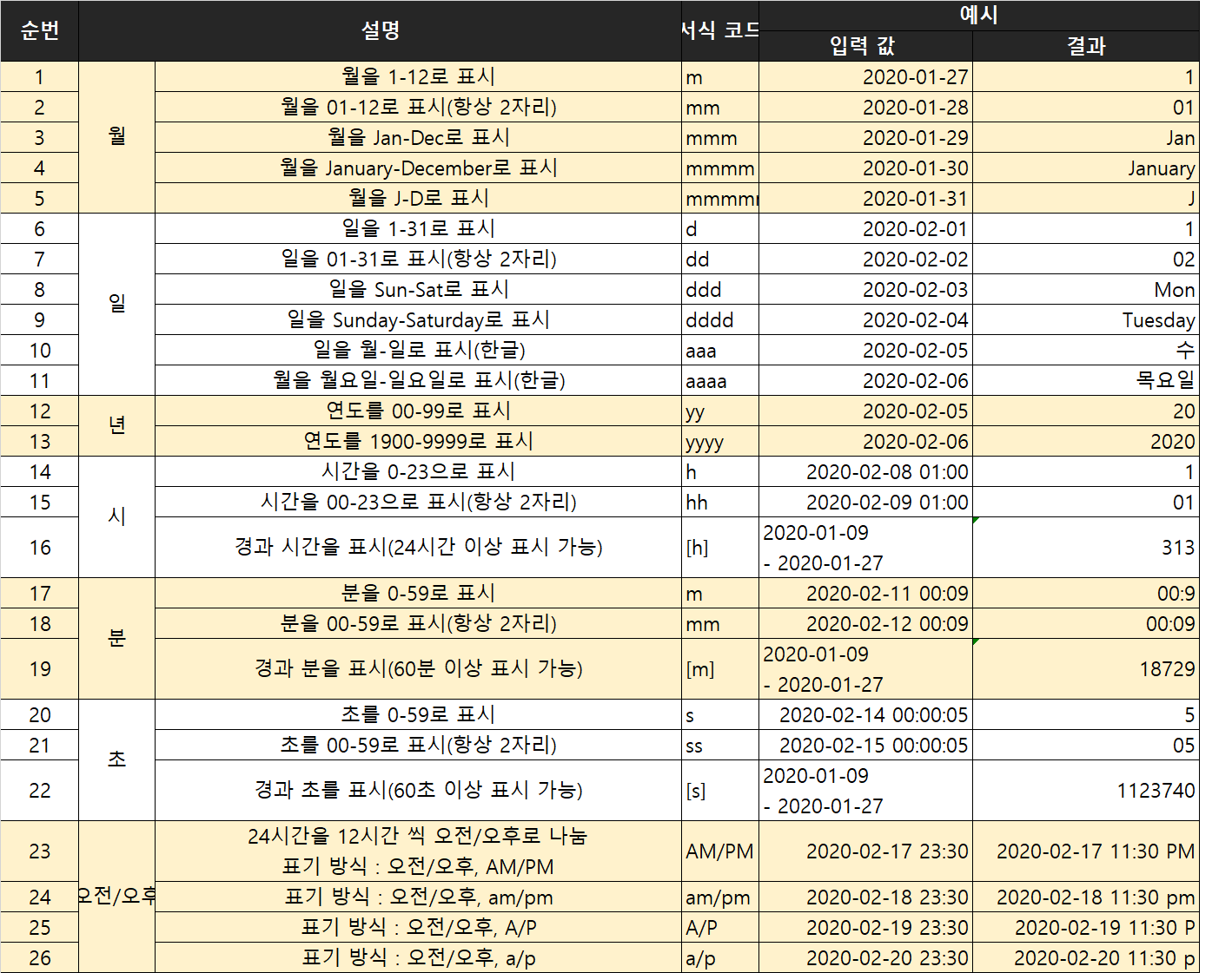 추가로 엑셀로 셀 서식 '날짜' 정리한 파일 첨부했으니 필요하신 분은 다운로드해서 사용하시기 바랍니다.