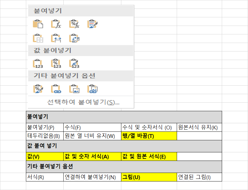 엑셀에는 여러 가지 붙여 넣기 옵션이 있습니다.