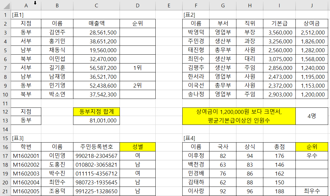 (요약) 컴활 2급 실기 문제 풀이, 참고해서 엑셀에서 유용한 기능 및 함수 탐색 완료