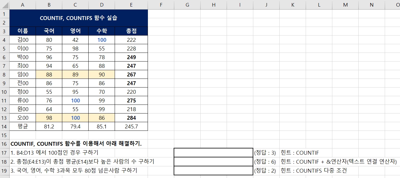 - 1. B4:D13에서 100점인 경우 구하기 : =COUNTIF(B4:D13,"100")