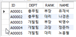 | -- 테스트용 DB 생성 CREATE database GROUP_CONCAT; -- DB 선택 USE GROUP_CONCAT; -- 테스트용 부서(DEPARTMENT) 테이블 생성 CREATE TABLE IF NOT EXISTS `DEPARTMENT` ( `ID` VARCHAR(8) NOT NULL, `DEPT` VARCHAR(10) DEFAULT NULL, `RANK` VARCHAR(8) DEFAULT NULL, `NAME` VARCHAR(8) DEFAULT NULL ) ENGINE=InnoDB DEFAULT CHARSET=utf8; -- 테스트 데이터 INSERT INSERT INTO `DEPARTMENT` (`ID`, `DEPT`, `RANK`, `NAME`) VALUES ('A00001', '총무팀', '부장', '유재석'), ('A00002', '총무팀', '대리', '나경은'), ('A00003', '개발팀', '부장', '박명수'), ('A00004', '개발팀', '과장', '정준하'), ('A00005', '개발팀', '대리', '노홍철'); -- 부서 테이블 확인 SELECT * FROM DEPARTMENT; |