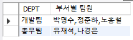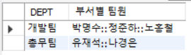 | -- 1번 쿼리 : 부서별 팀원 GROUP_CONCAT SELECT DEPT, GROUP_CONCAT(NAME) AS '부서별 팀원' FROM DEPARTMENT GROUP BY DEPT; |