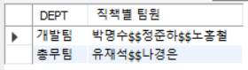 | -- 4번 쿼리 : 구분자를 '$$'로 변경하고 직책별 팀원을 ID 오름차순으로 GROUP_CONCAT SELECT DEPT, GROUP_CONCAT(NAME ORDER BY ID SEPARATOR '$$') AS '직책별 팀원' FROM DEPARTMENT GROUP BY DEPT; |