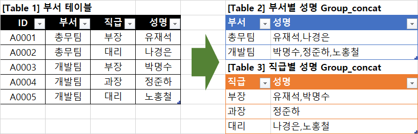 [Table 1] '부서 테이블' 이 있을 때 [Table 2] 부서별 성명, [Table 3] 직급별 성명으로