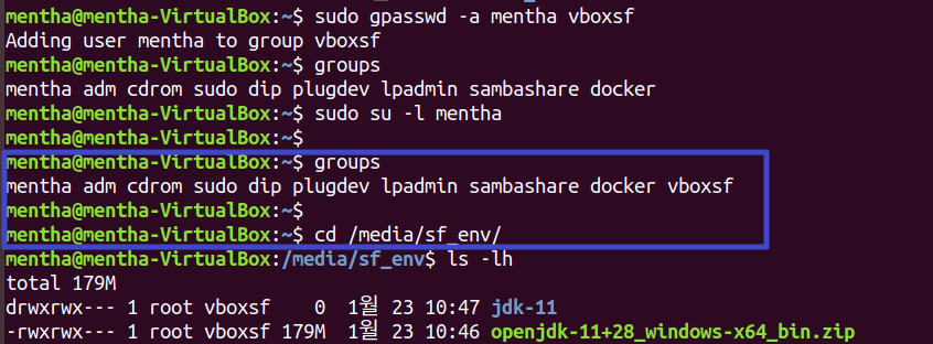 # 사용자계정(mentha)를 vboxsf 그룹에 추가
