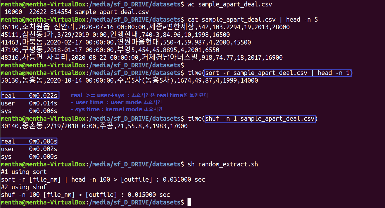 아래에 time 명령어를 활용한 sort, shuf 명령어 실행시간 테스트 결과도 첨부합니다.
