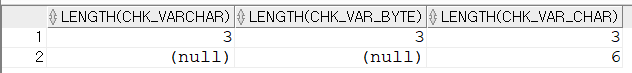 한글 3글자는 CHK_VAR_BYTE, CHK_VAR_CHAR 2개 컬럼 모두에 INSERT 가능