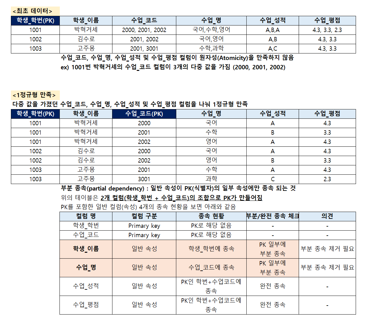| 학생_학번(PK) | 수업_코드(PK) | 수업_명 (부분 종속 예시) | 수업_성적_코드 (완전 종속) |