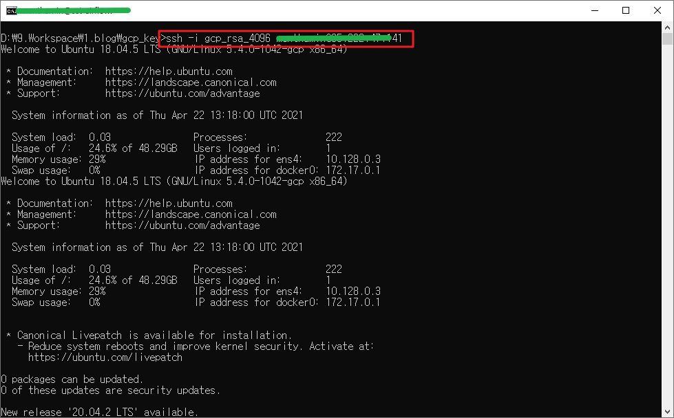 아래 절차를 따라 하시면 최종적으로 로컬 컴퓨터에서 다음과 같은 명령어로 GCP 서버 접속이 가능합니다.