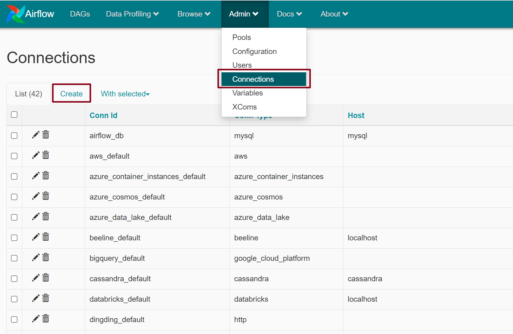 - Admin → Connections → Create 클릭