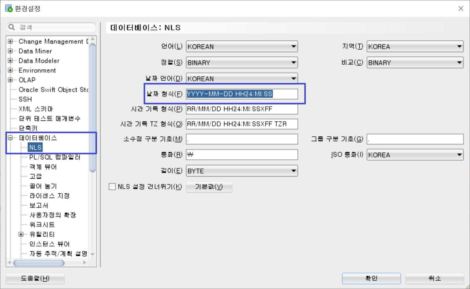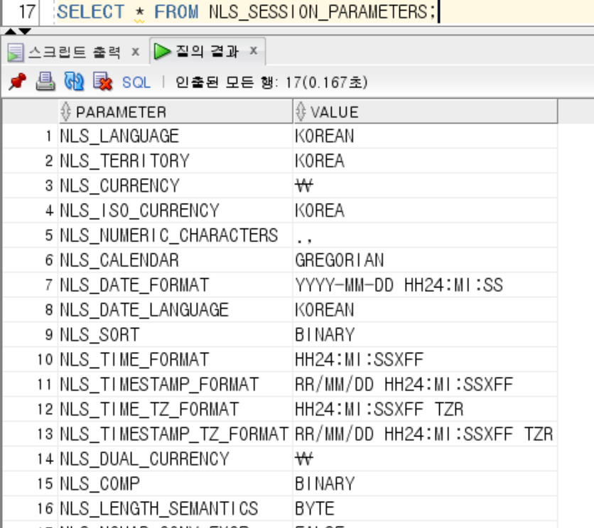 -- NLS 설정 확인 명령어 (NLS_SESSION_PARAMETERS 뷰에서 확인)