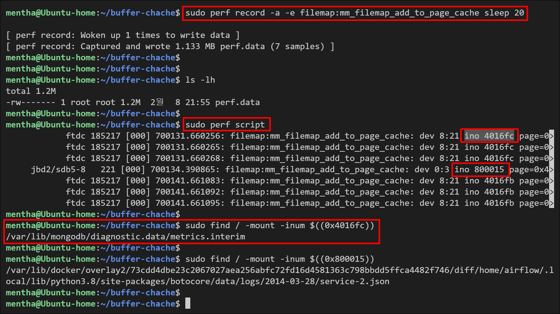 perf(Performance Counter for Linux) 명령어를 사용해 리눅스 buffer cache에 올라가 있는 파일을 확인하는 방법입니다.