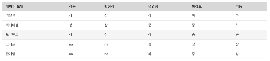 NoSQL Type별 특성 (출처: Data On-Air, https://dataonair.or.kr/db-tech-reference/d-guide/data-practical/?mod=document&uid=389)
