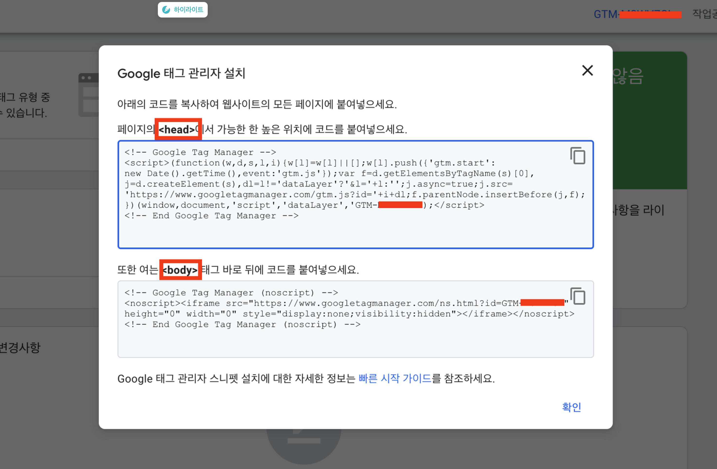(구글 태그관리자 공식 설치 공식문서에서 <head>, <body> 2개 영역 모두에 코드 추가를 권장)