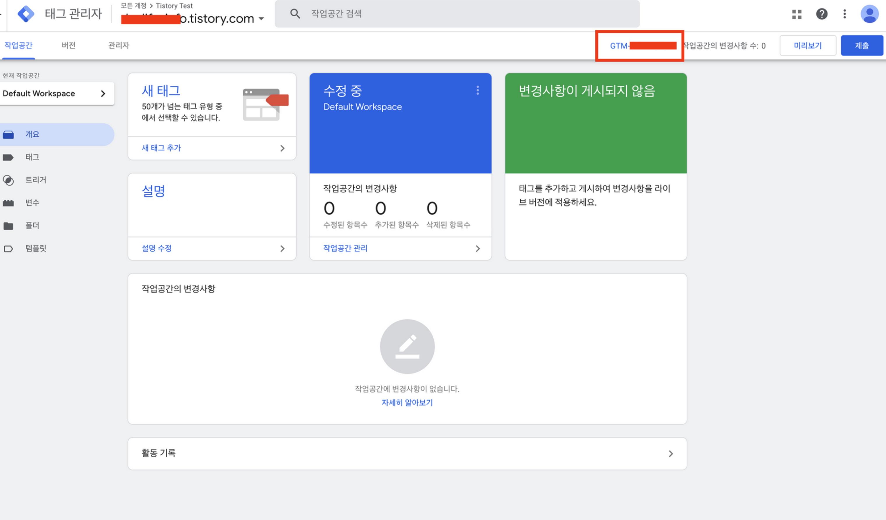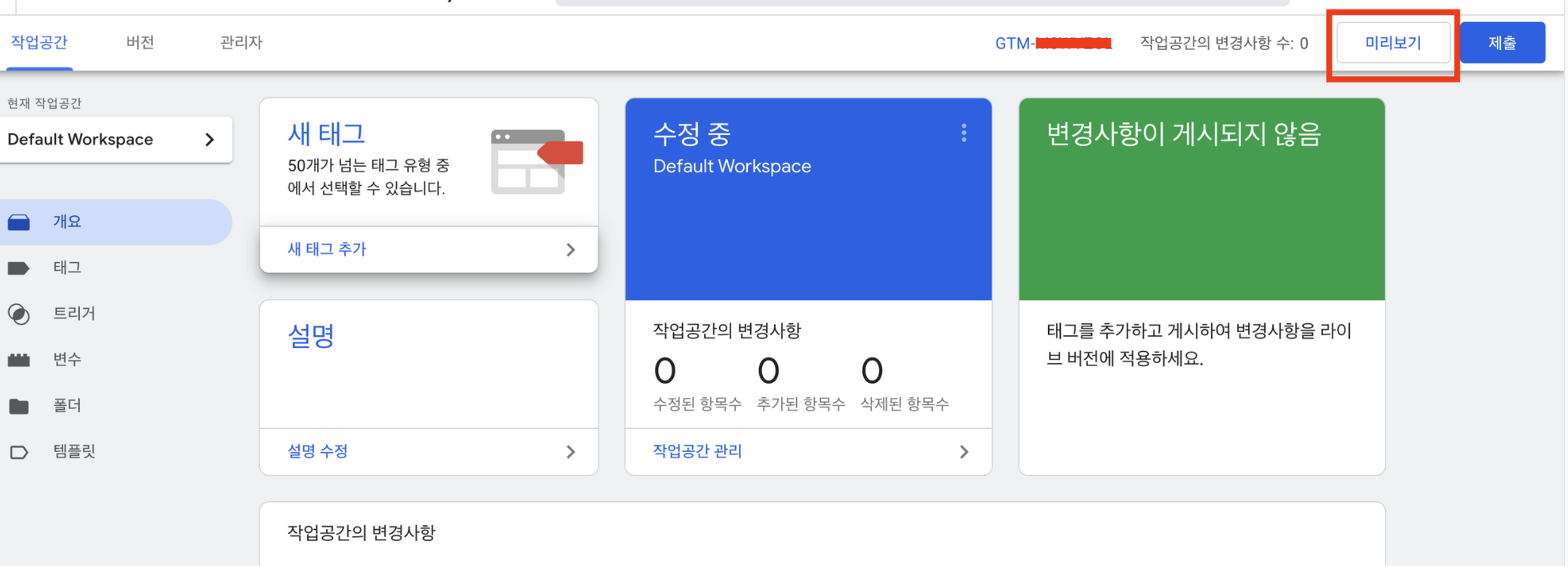 태그 관리자 '작업공간'에서 'GTM-XXXXXX'를 클릭합니다.