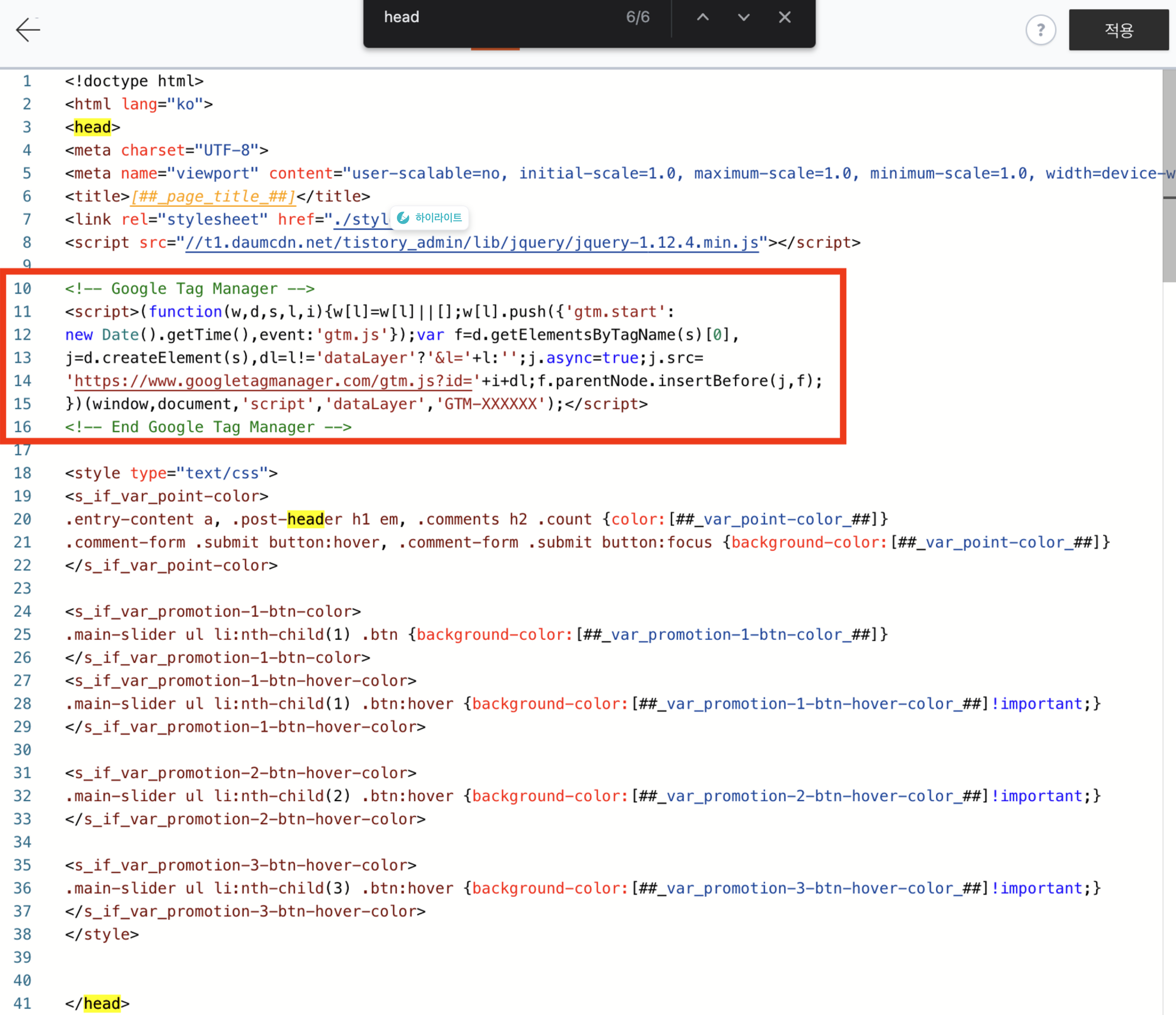 "컨트롤(커맨드) + f"로 head를 검색해서 <head> … </head> 사이에 구글 태그 관리자 코드 붙여 넣기