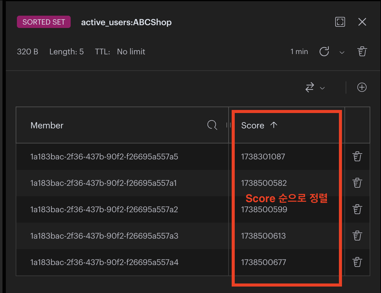 - ZSET 특징: 집합의 멤버들이 Score순으로 자동 정렬되고 O(N)이 아닌 O(log N + M) → 탐색(log N) + 삭제 개수(M)의 효율적인 시간복잡도로 멤버를 삭제할 수 있습니다.
