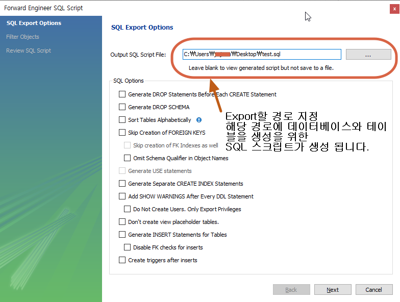 SQL 스크립트를 저장할 경로 설정, 해당 경로에 스크립트가 생성됩니다.