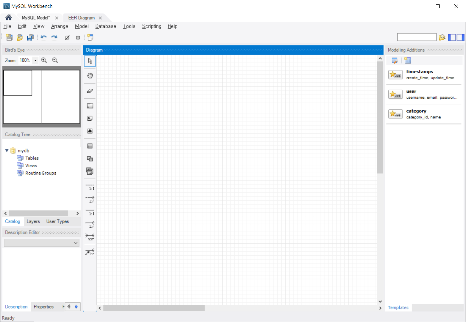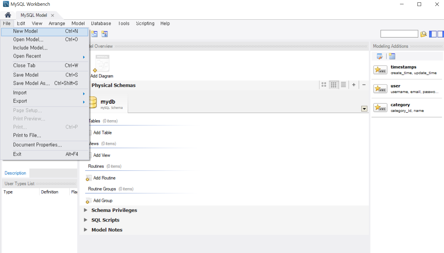 ERD를 만들기 위해 File - New Model을 클릭합니다(단축키 : 컨트롤 + N)
