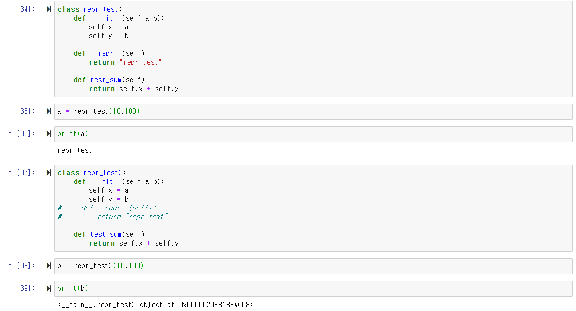 repr_test를 상속받은 인스턴스 a와 repr_test2를 상속받은 인스턴스 b를 print로 출력했을 때 다른 결과가 나오는 것을 볼 수 있습니다.