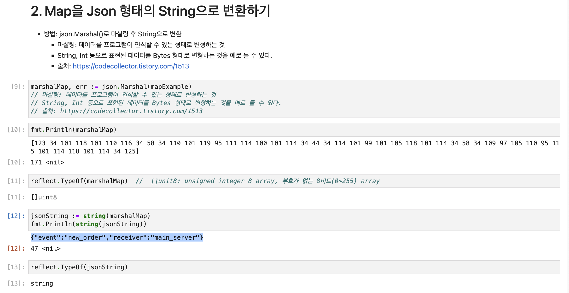 회사에서 Go 언어를 조금 사용하고 있는데, 정리하지 않으니 계속 찾게되어 기억하기 위해 적어봅니다. 요약 json.Marshal() 함수로 Map 타입 데이터를 마셜링 후 String으로 변환 *Marshalling(마셜링): 데이터를 프로그램이 인식할 수 있는 형태로 변형하는 것 String, Int 등으로 표현된 데이터를 Bytes 형태로 변형하는 것을 예로 들 수 있음 출처: https://codecollector.tistory.com/1513 예제 코드 package main import ( "fmt" "encoding/json" "reflect" ) func main() { // Map 선언 및 초기화 var mapExample map[string]string // 선언한 Map Type 확인..