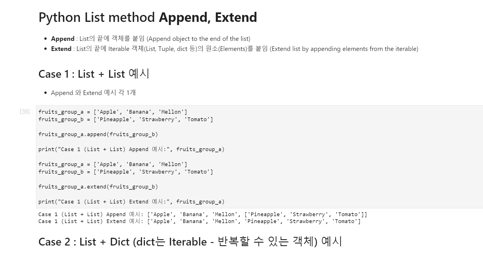 Python list의 2가지 메서드(Method)에 대한 포스팅입니다. List의 끝에 객체를 붙여 넣는 Append 메서드는 Python 사용자 대부분이 알 것 같습니다. Extend 메서드는 모르는 분들이 제법 있는 것 같은데, 리스트에 다른 리스트를 리스트가 아닌 원소 개별로 붙여야 할 때 유용합니다. 두줄 요약 - Append : List의 끝에 객체를 붙임 (Append object to the end of the list) - Extend: List의 끝에 Iterable 객체(List, Tuple, dict 등)의 원소(Elements)를 붙임 (Extend list by appending elements from the iterable) - Append 결과 >> ['Apple', 'Ba..